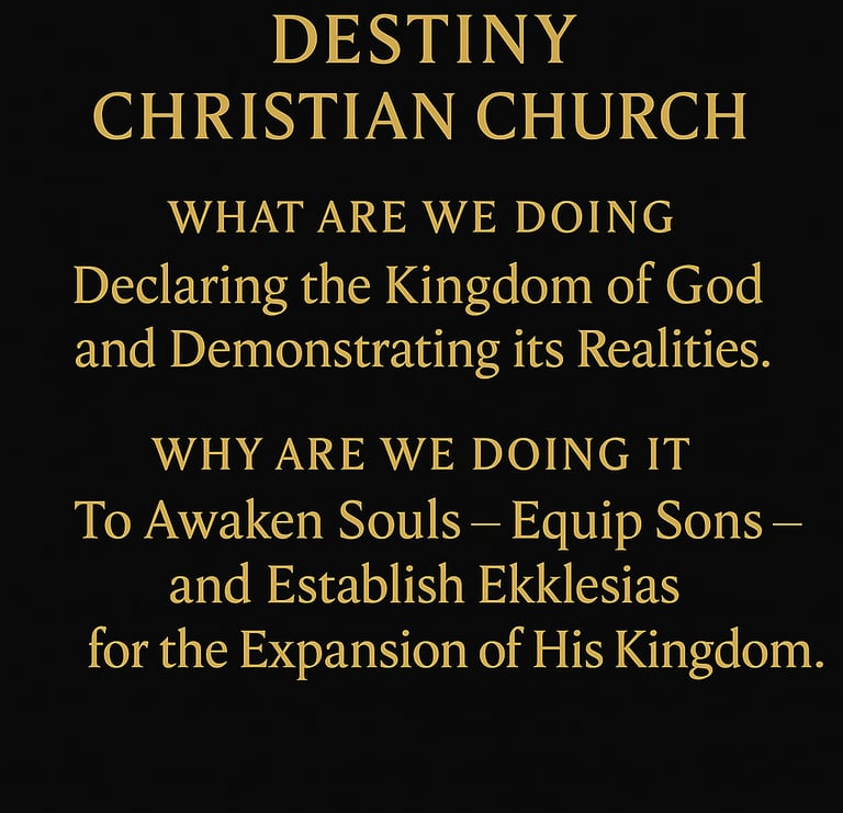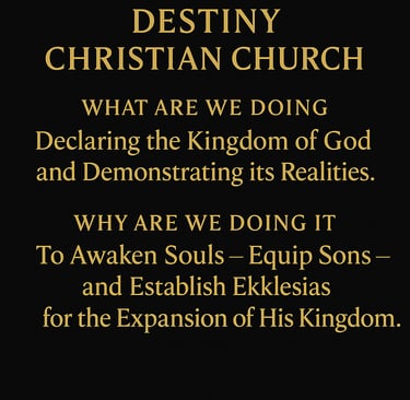 Destiny Christian Church stands as a Five-fold Kingdom Community devoted to manifesting the life of Christ in every sphere of society. We affirm that biblical truth is timeless, that conscience and worship belong to God alone, and that righteousness, mercy, and justice flow from His throne—not from human institutions.